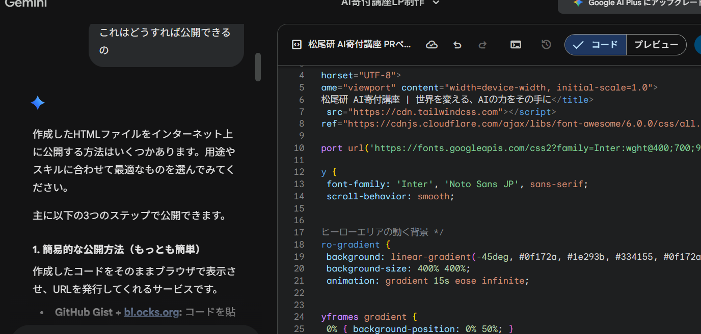 ・保存した index.html ファイルをダブルクリックすると、ブラウザが立ち上がり、作成した松尾研のPRページが表示されます。もし、このファイルをインターネット上で公開する(URLを作る)具体的なサービス手順が必要であれば、教えてくださいね。